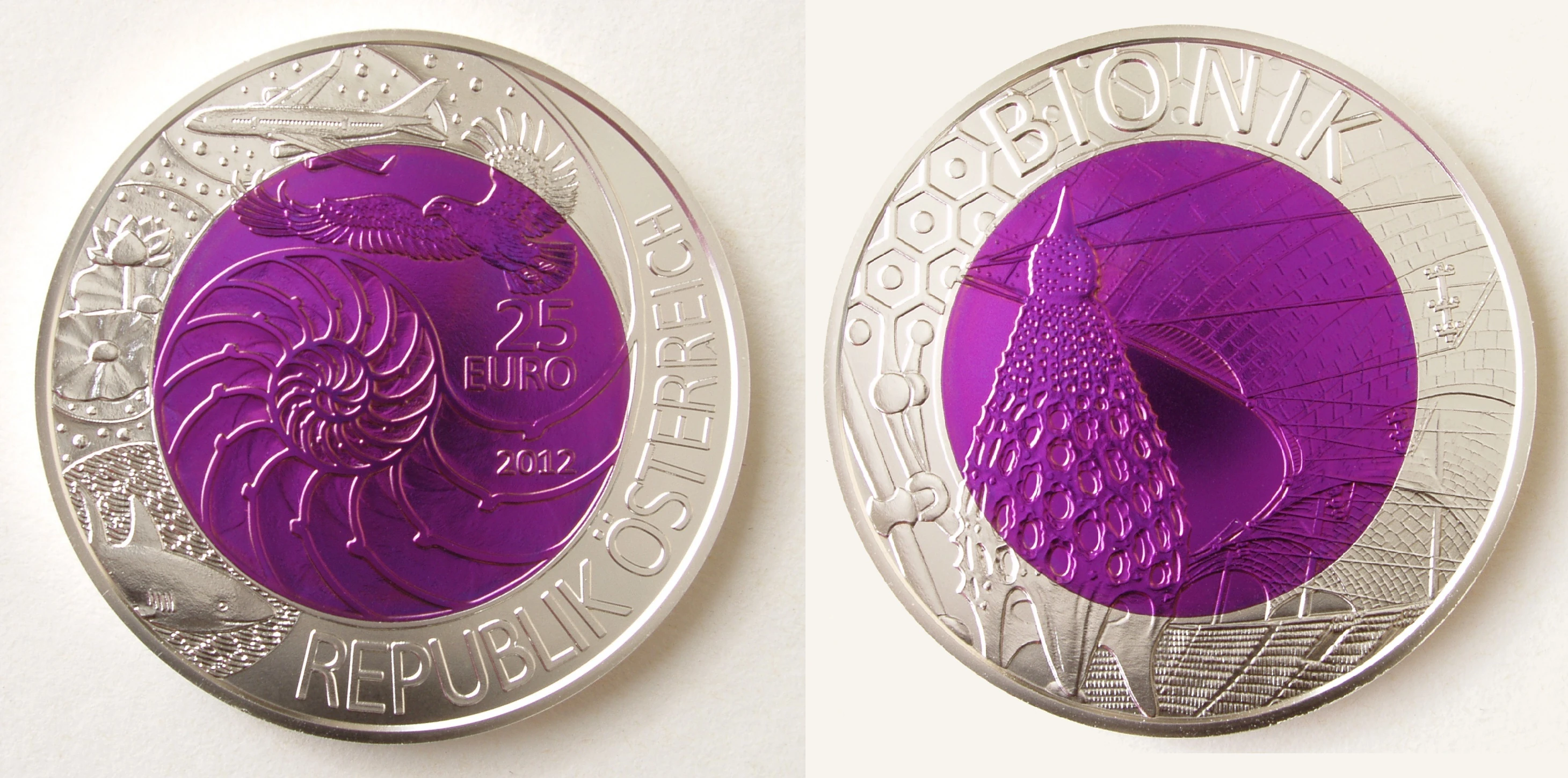 The 25 euro coin issued by the Austrian Mint in 2012, entitled "Bionik", uses bionics, the application of biological methods and systems to engineering, as its main motif. Its obverse was engraved by Thomas Pesendorfer while its reverse was designed by Herbert Wähner. The niobium center of the coin is purple in color.