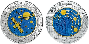In commemoration and recognition of the Galileo global navigation satellite system currently being built by the European Union and European Space Agency, the Austrian mint produced a 25 euro coin in 2006 using it as its focus. Herbert Wähner was commissioned by the mint to design its obverse, while Thomas Pesendorfer was called on to create its reverse. The niobium "pill" in the center of the 2006 coin is gold-brown in color.