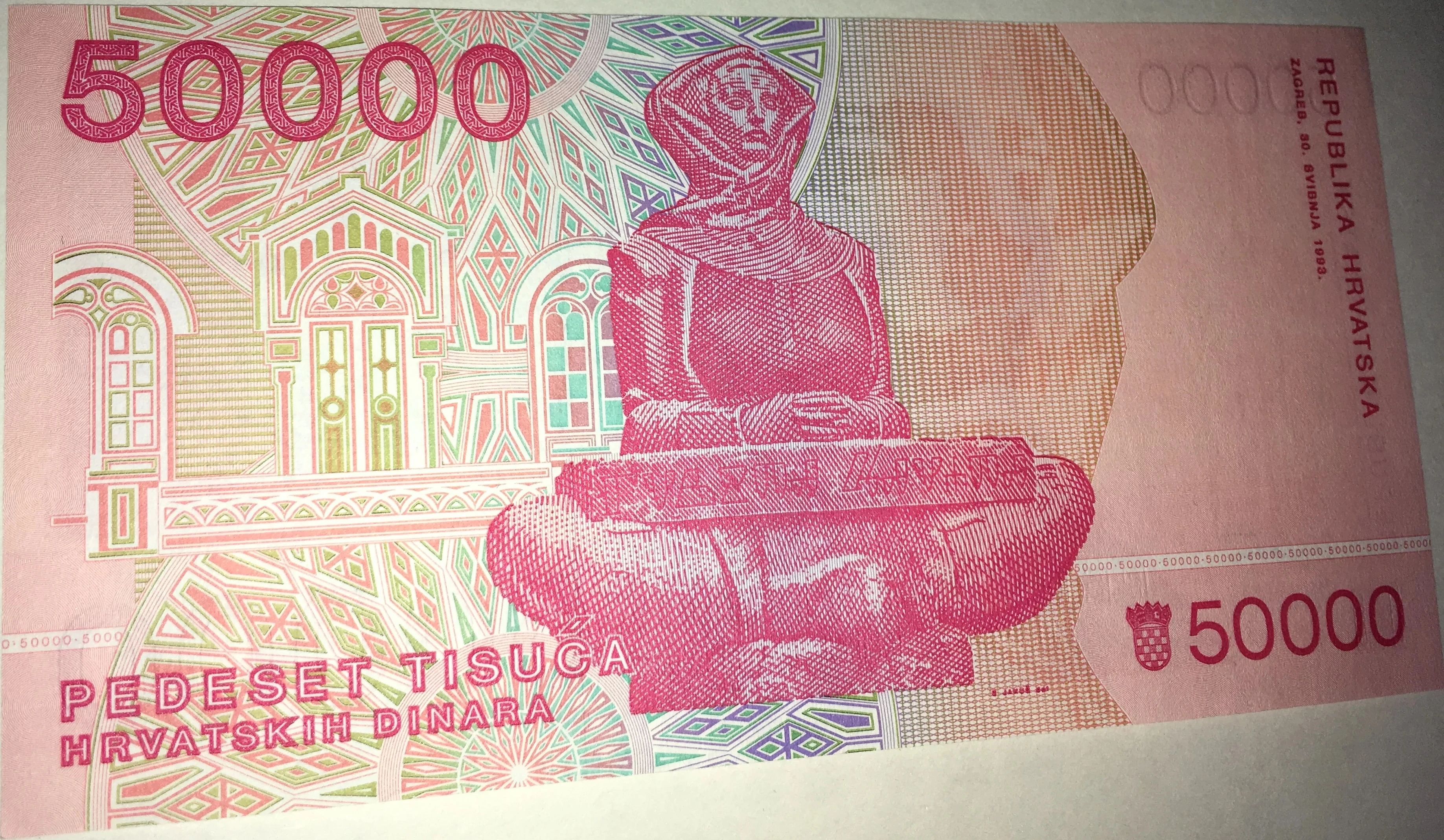 The Croatian 50,000 dinar banknote is a banknote from the obselete Dinara currency that Croatia used to use. They now use the Kuna.