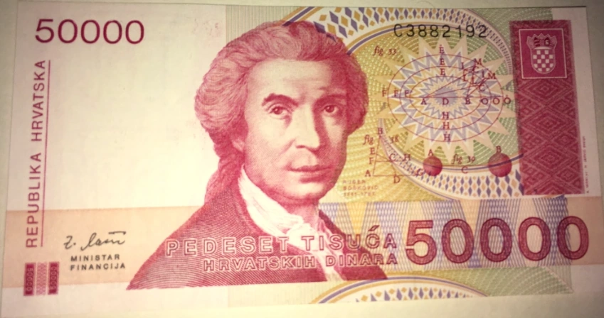 The front of the bill says "Pedeset Tisuca, Hrvatskih Dinara," which means 50,000 Croatian Dinara. It also has a portrait of Ruder Soskovic (1711-1787). The back is the same, but instead of Soskovic, it contains a statue of a woman in a veil.