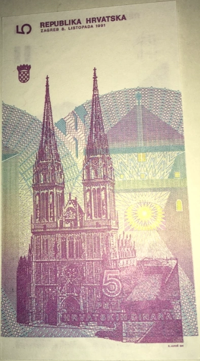 The Croatian 5 dinar banknote is the denomination in the obsolete Dinara currency of Croatia of 5 dinara.