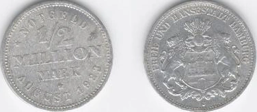 The ½ million mark coin is a notgeld piece that was issued by the Free and Hanseatic City of Hamburg in August 1923, during its period as a city-state of the Weimar Republic and in the midst of extreme hyperinflation. It was produced at the Hamburg Mint, as can be identified from the "J" mark on the obverse. The piece had a value equivalent to 500,000.00 mark prior to its demonetization, but as a token coin exclusive to Hamburg, it could only be used as payment there.