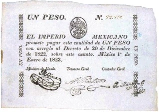 On January 1, 1823, the first 1 peso note (valued at 8 Mexican reales) was introduced. It was predominantly white in color with black ink. Displayed on the obverse was the coat of arms of Mexico with the value and a promise to pay the bearer the written value of the note. There was no design on the reverse of this issue. Later that year, on May 5, a new 1 peso note was introduced. This note's obverse was similar to the January 1 issue, but rather than the reverse having no design, images and text were added. Both notes were eventually demonetized.