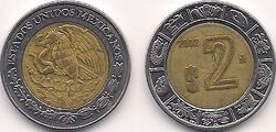 The Bank of Mexico commissioned the Mexican Mint to begin production of a new 2 peso coin in 1992, the first coin of the denomination since 1948. Such coins would later be issued in 1993, when a new national currency, the nuevo peso, was introduced. The 2 peso coin is bimetallic, consisting of an aluminum-bronze center composed of 92% copper, 6% aluminum, and 2% nickel surrounded by a stainless steel outer ring. It weighs a total of 5.19 grams, the ring making up 2.81 of those grams and the center constituting for the remaining 2.38 grams. The coin measures 23 millimeters in diameter and 1.4 millimeters in thickness. A majority of the Mexican coat of arms is engraved in the aluminum-bronze center of the obverse. Above it, inside the stainless steel ring, is the title "ESTADOS UNIDOS MEXICANOS", and below, also in the ring, are oak and laurel leaves tied together with a ribbon, the only portion of the arms not present in the center. The value, inscribed as "N$2" from 1992 to 1995, and simply as "$2" from 1996 to the present, is featured in the center of the reverse, with the year of minting inscribed above and the "Mo" mint mark printed to the right. A stylized image of the "Ring of Days" in the Aztec calendar stone is detailed on the outer ring. A total of 201,006,981 2 peso coins bearing the "N$2" value were produced from 1992 to 1995, including 6981 proofs from 1995, while a reported 1,147,895,000 1 peso coins were minted between 1996 and 2010. Such coins continue to be produced and circulated in Mexico.