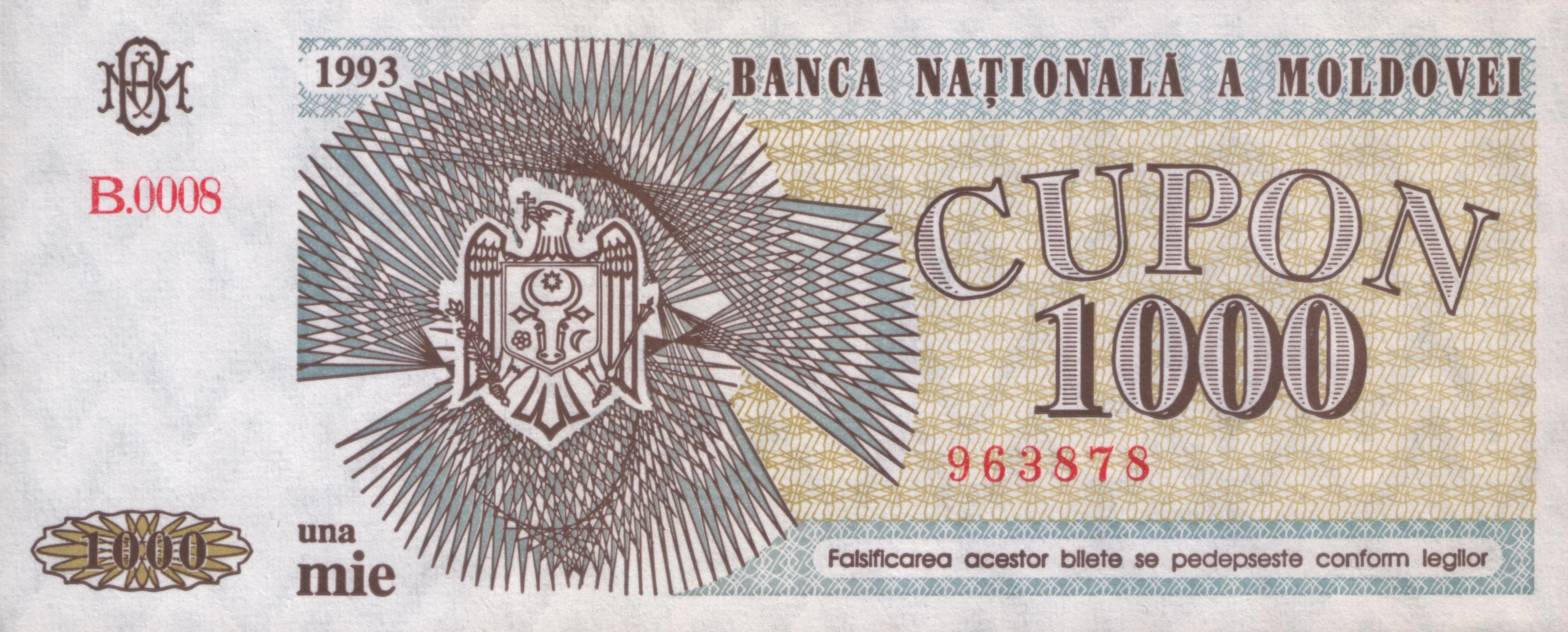The 1000 cupon banknote is a banknote that was issued in 1993 by the Republic of Moldova. It was distributed by the National Bank of Moldova (BNM), the Moldovan central bank. Since the cupon was pegged to the Russian ruble at a rate of 1:1, the note had a value equivalent to 1000 cupon and 1000 rubles during its issuance, but when Moldova replaced the cupon with the leu in 1993, the 1000 cupon banknote temporarily became worth one leu before its eventual demonetization. Today, cupons are no longer used in transactions, and only hold value to currency collectors.
