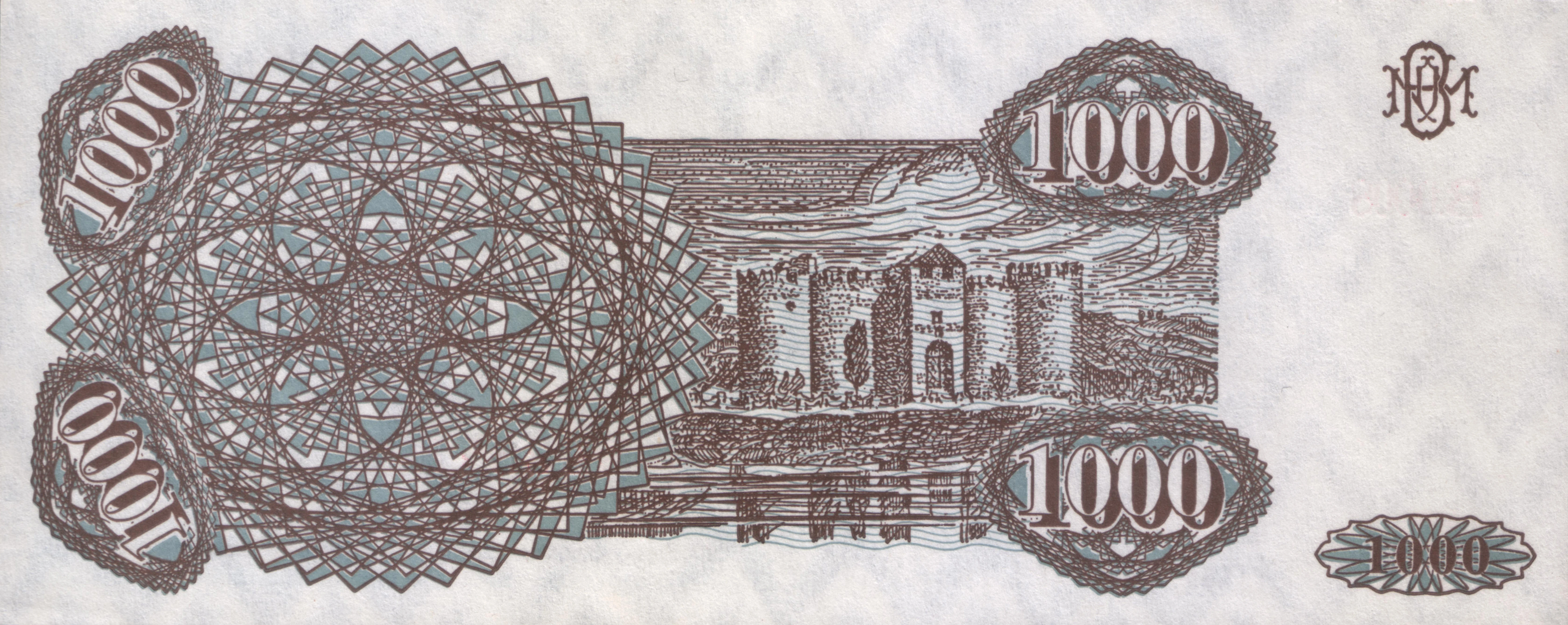 An illustration of the Soroca Fortress, a historic stronghold located along the Dniester River in Soroca, Moldova, is displayed in brown at the right center of the reverse's colored portion. To the left of this depiction, primarily in brown but with portions of blue, is a circular rosette-like pattern. The value "1000" is written in white with a dark brown shadow at each of the left corners of the note, slanted and located inside of a decorative triangular border. The numeral at the upper left is angled in an upward direction, while that at the bottom left is slanted downward. Two more examples of the numeral are present at the right corners of the colored area, but instead printed horizontally. The triangular border around the upper of the rightmost numerals has its point directed towards the top of the note, and the border around the lower numeral has its vertex positioned to the bottom of the piece. At the upper right corner of the reverse, in the blank area, is the logo of the National Bank of Moldova, and in the lower right the value "1000" is printed in brown inside of a border with a blue, geometrically-designed background. Just like on the obverse, the area between the bank logo and the denomination is blank, but displays a watermark when the note is held up to the light.