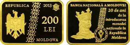 The leu was established as the national currency of the Republic of Moldova in 1993, after replacing the short-lived cupon currency. In 2013, the National Bank of Moldova issued two coins, 100 and 200 leu pieces, in commemoration of the 20th anniversary of the inception of the Moldovan leu. Both commemoratives are rectangular in shape, being the first non-circular coins ever produced for Moldova. The 200 leu coin is composed of .999 fine gold, weighs approximately 15.5 grams, and measures 40 millimeters in width by 28 millimeters in height. It uses medallic alignment and has a reeded edge.