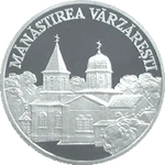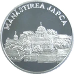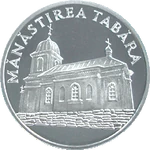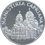 Article 57 of the Law on the National Bank of Moldova, passed in 1995 by the Moldovan Parliament, authorizes the National Bank of Moldova (BNM) to distribute commemorative currency. Moldova, a primarily Eastern Orthodox nation, contains numerous historic monasteries dating as far back as the 15th century. On December 25, 2000, the BNM exercised its right to issue non-circulating legal tender by introducing the Monasteries of Moldova series, in celebration of Moldova's cultural and religious heritage. Twenty monasteries were featured on twenty different proof coins produced that year at the Czech Mint in Jablonec nad Nisou, Czech Republic. The pieces were initially distributed in as many as 1,000 sets, but many of these sets were subsequently broken down and the coins were sold individually to collectors. The monastery in Căpriana received many of the coins celebrating the 15th century structure through donations by a bank. As such, this particular piece is harder to come by than most of the other 2000 coins and carries a higher price tag.