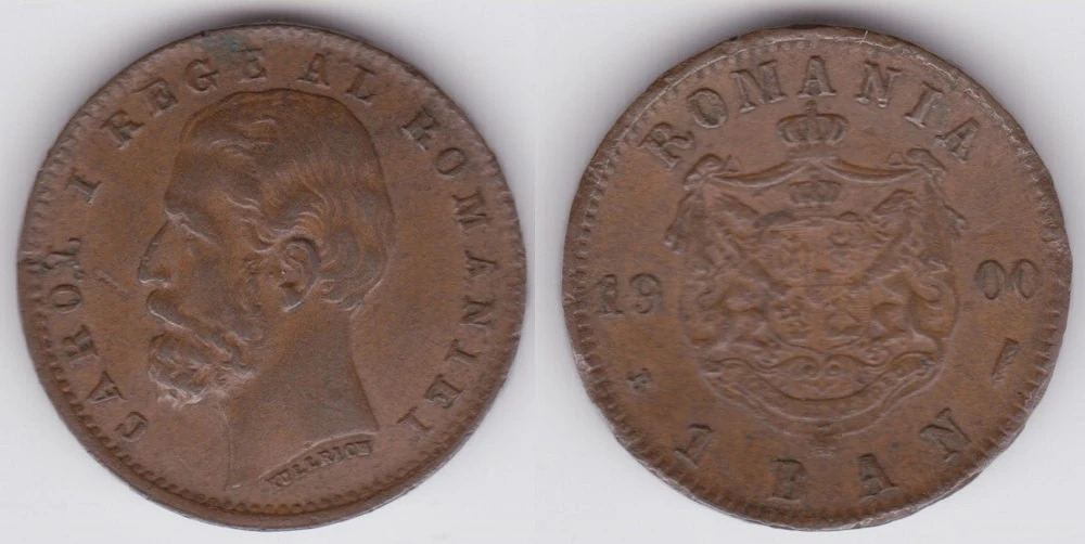 In 1900, around the middle of Carol I's reign, Romanian officials were prompted to introduce a new 1 ban coin for circulation. The presentation pieces made in 1883 and 1888 served as the basis for the 1900 coin, which essentially features the same designs that Kullrich had drafted in the 1880s, with some minor modifications. Commissioned to produce the 1 ban piece of 1900 was the mint in Hamburg, a German state, although the mint and privy marks of the Monetǎria Statului of Romania in Bucharest were not omitted from the obverse after the original designs were revised. The coin is composed of copper, and like the 1867 circulation pieces, has a mass of 1 gram and a diameter of 15 millimeters. It has coin alignment and a plain edge, and is round in shape.