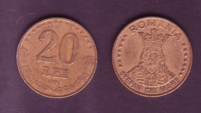 In 1991, two years after the fall of Communist Romania, a 20 lei coin was issued by the National Bank of Romania in the 1990 series of coins of the third leu. The coin was not nearly as small as its 1951 predecessor in mass, but had a smaller diameter, at 24 millimeters. Along with the 50 lei coin, it became the first Romanian coin to be composed of brass plated steel. The coin's obverse featured Stephen the Great surrounded by fourteen pearls, with the legend, "Ştefan Cel Mare". The reverse displayed the value and year of minting surrounded by an oak wreath and a sector of fifteen pearls. This coin's minting ended in 2003, and was officially demonetized in 2005.[1][4]