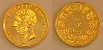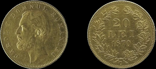 The first 20 lei coin of Romania, designated as the pol (plural: poli) was issued by the Kingdom of Romania under the reign of Carol I in 1867. It was composed of 900/1000 gold, weighed 6.452 grams, and had a diameter of 21 millimeters. The coin's obverse featured the king of Romania at the time, Carol I, while its reverse displayed the coin's value surrounded by two oak wreaths.[2][5]