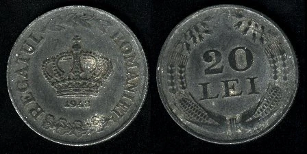From 1942 to 1944, during the second reign of Mihai I, a new 20 lei coin was minted. This coin was comparably lighter and smaller in size, being composed of lighter zinc, with a mass of 6 grams and a diameter of 26 millimeters. The obverse of this coin featured the Steel Crown of Romania, the year of minting, and the legend, "REGATUL ROMANIEI". The reverse displayed the value surrounded by corn, oats, and wheat. A total of about 74.8 million of these coins were minted.[7][9]