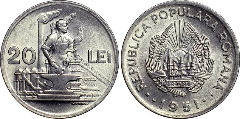 During 1951, four years after the establishment of Communist Romania, a new 20 lei coin was minted. It was comparably much lighter than its predecessor from the 1940s, being composed of a much lighter metal, aluminum. The coin, though much smaller in mass, still had the same diameter, 26 millimeters. The obverse of the coin featured the coat of arms of Communist Romania, along with the year and the official name of the country, "Republica Popular Romana". The reverse displayed a blacksmith near a factory, and the value of the coin. This coin was only minted during one year.[8]