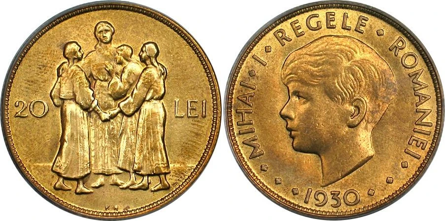 During 1930, two 20 lei coins were minted, due to two rulers reigning during that year, Mihai I and Carol II. Both the coins were very similar in composition and size, but very different in technical appearance. Both coins were composed of 79% copper, 20% nickel, and 1% zinc, had a mass of 7.5 grams, and a diameter of 27 millimeters. However, the designs of the obverse and reverse were different for each coin. The first of these was the coin of Mihai I. On the obverse, it displayed him with the legend, "MIHAI I REGELE ROMANIEI" as well as the year of minting. The reverse of the coin displayed dancing peasant women and the value of the coin. The coin of Carol II displayed him on the obverse, with the legend, "CAROL II REGELE ROMANIEI". The reverse of this coin displayed the coat of arms of Romania wearing the shield of the royal cipher of Carol II, its value, and its year of minting.[1][3]