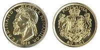 During 1922, the second commemorative 20 lei coin was minted, commemorating five years since the coronation of Ferdinand. It was composed of 900/1000 gold, had a mass of 6.452 grams, and a diameter of 21 millimeters. The coin's obverse featured Ferdinand wearing a laurel wreath, while the reverse depicted the coat of arms of Romania at the time and the value.[6]