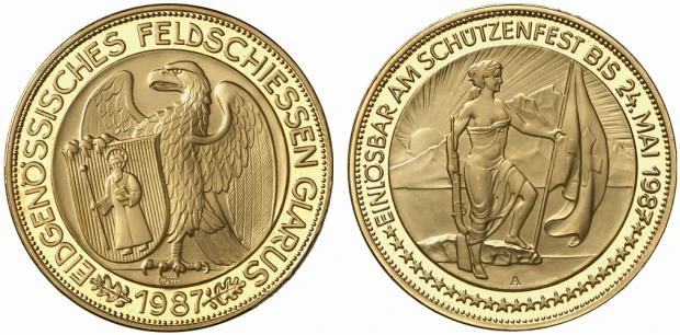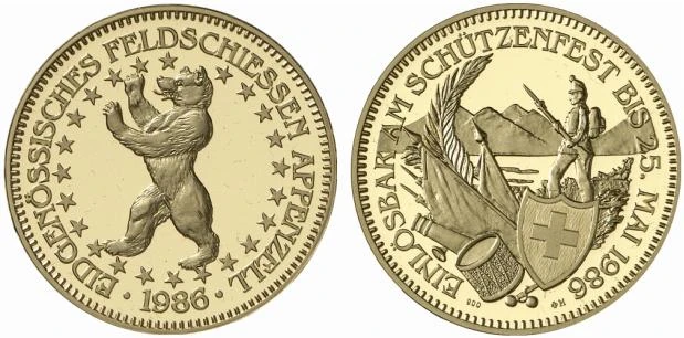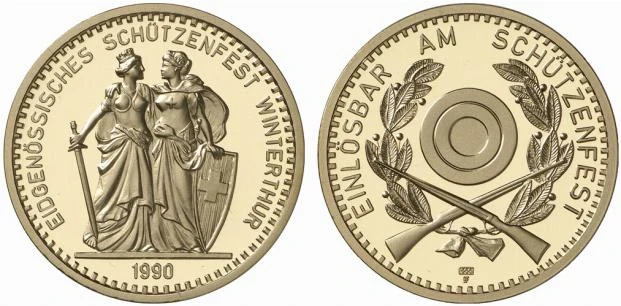All of these coins were composed of gold. The first was minted in 1984, commemorating the shooting festival in Oberhasli. Every year after that, until 1994, the coins were issued annually. Today they are replaced by the 500 franc coin.