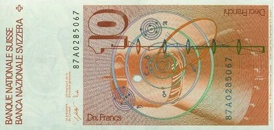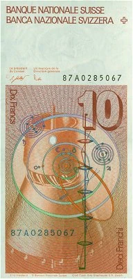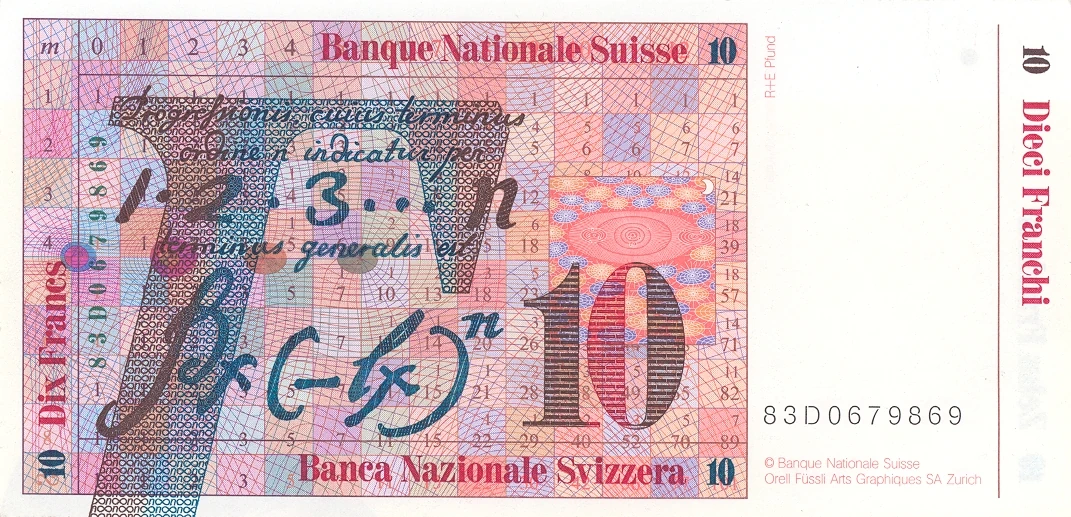 A 9 × 14 table for calculating numbers makes up the background of the colored area of the reverse of the note, as do several wavy lines. The squares of the table are of varying colors and each bears different numbers. Also in the background of the note are four oval-shaped objects. A large black gamma (Γ) comprised of several "n" and "∞" (infinity) symbols is displayed in the colored area, representing the gamma function, which Euler worked on during his lifetime. Superimposing this gamma in black ink is the Latin text "Progreffionis, cuius terminus ordine indicatur per terminus generalis est " (English: "Since the general term of the progression, of which the term with the order n is indicated by 1.2.3...n, then the general term is ∫..."), which was taken from Euler's mathematical paper De Progressionibus Transcendentibus, Sev Quarum. A depiction of the solar system is present to the right of the large gamma, as is a large numeral "10" composed of black horizontal bars which slightly superimposes the former-mentioned illustration. The French "Banque Nationale Suisse" is printed in red in a border at the top of the note, followed by a blue "10", while the Italian "Banca Nazionale Svizzera" is written at the bottom of a note with a blue "10" next to it. Printed in an upward direction to the right of the colored area, near the top of the note, is "R+E Pfund", signifying the banknote's designs were drawn by Roger and Elisabeth Pfund. The Italian value "DIECI FRANCHI" is printed in red ink in a downward direction at the right border of the note, accompanied by a blue "10" traveling in the same direction and a border to the left. The French value "DIX FRANCS", however, is included at the opposite side of the note, a "10" in front of it and a border to its right. The seven digit serial number, preceded by the last two numbers of the date and a letter, is written in black adjacent to the colored area. Printed below in a smaller, reddish font is "© Banque Nationale Suisse", which is followed on a line below by "Orell Füssli Arts Graphiques S.A. Zurich". Both of these texts signify that the note is owned by the Swiss National Bank and was printed at Orell Füssli.