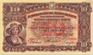 The 10 franc/Franken/franco banknote is a current circulation note that has been issued in multiple types by the Swiss Confederation (Switzerland) since 1914. The initial 1914 notes were issued in three language varieties – French, German, and Italian – by the Federal Treasury in Bern. In 1921, the Swiss National Bank (SNB) authorized the creation of a reserve 10 franc note of the second series that ultimately did not see any circulation. It was not until the fifth series of Swiss banknotes, introduced in 1956, that a note denominated at 10 francs was put into circulation. Such a note was printed from 1955 to 1977 and ultimately recalled in 1980. The issuance of the sixth series of notes, beginning in 1979, introduced a new 10 franc banknote, which would be produced until 1992 and recalled in 2000. In case of widespread counterfeiting, a reserve series of Swiss banknotes, including a ten franc note, was printed in 1984; however, the need for a new series to suddenly be introduced never presented itself, so the seventh series notes were never circulated. The current 10 franc note of the eighth series has been issued since 1997, although production actually began in 1995. As early as 2015 the ninth series of Swiss paper money is expected to be released, and with it a new 10 franc banknote.