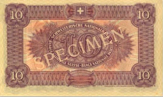 A decorative border is present along the edges of the note's reverse. In the center of the upper and lower borders is a round design element. Inside of this element on the top border is the coat of arms of Switzerland, slightly different in design from the arms presented on the obverse. The numeral "10" is printed in each of the corners of the note, inside of flower-like boundaries decorated with elaborate designs. A large "10" is also present in the middle of the reverse, printed over an ornate background. Encircling it is an oval-shaped border bearing the titles of the Swiss National Bank in German, French, and Italian. The German "SCHWEIZERISCHE NATIONALBANK" is printed in a clockwise direction at the top of the border, while the French "BANQUE NATIONALE SUISSE" and Italian "BANCA NAZIONALE SVIZZERA" are written in that order in a counterclockwise direction at the bottom. Each bank title is separated from the other by a small bullet point. At both sides of the oval-shaped border is a decorative rosette, and printed in small text below the lower border of the note and to the left of the bottom right "10" is "WATERLOW & SONS LIMITED LONDON". The presence of this text signifies the note was produced by Waterlow and Sons in London, England.