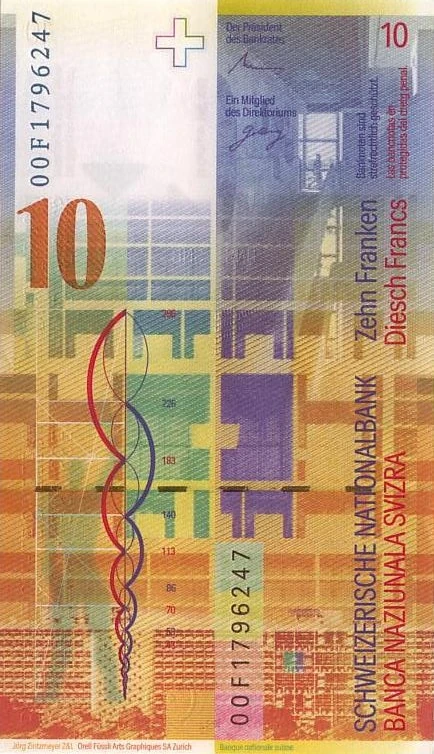 Featured at the upper right corner of the reverse, mostly in a dark blue ink, is the lobby of the Palace of Justice in Chandigarh, India, which was designed by Le Corbusier. Superimposing the upper left of the illustration is the signature of the President of the Bank Council, and the signature of a member of the Board of Directors is included below it. Printed in dark blue on two lines above the first signature is the German title "Der Präsident des Bankrates", and captioning the second signature is "Ein Mitglied des Direktoriums", also on two lines. The lines of the former are separated between "Präsident" and "des", whereas those of the latter are separated between "Mitglied" and "des". On notes printed from 1995 to 1996 the signature of Jakob Schönenberger (1931–) is included under the "President" field; Eduard Belser's (1943–) signature is present under this caption on the 2000 notes, while the signature of Hansueli Raggenbass (1948–) is shown on pieces produced from 2006 to 2012. So far, the signatures of nine individuals have appeared under the "Ein Mitglied des Direktoriums" caption. A white area is shown to the left of the depiction of the lobby of the Palace of Justice. At the upper right corner of it is a Swiss cross, which is in the same location as the cross on the obverse. Printed vertically in an upward direction, in blue, at the left of this area is the serial number, preceded by the final two digits of the date and a letter. A large, red number "10" featured below the serial number. The facade of the Secretariat Building in Chandigarh, also designed by Le Corbusier, is illustrated below the "10" and the depiction of the Palace of Justice, along with what some sources describe as a ground plan for the Chandigarh government district. The numbers "296", "226", "183", "140", "113", "86", "70", "68", and "43" are also featured. Printed over portions of the image of the Secretariat is a representation of the Modulor, an anthropometric scale of proportions developed by Le Corbusier, which shows a dark human figure standing in front of a red and blue spiral. The Secretariat Building is again shown at the bottom of the reverse. Printed in red at the very bottom of the note, in a small white area, is the text "Jörg Zintzmeyer Z&L" followed by "Orell Füssli Arts Graphiques SA Zurich". The first text signifies the note was designed by Jörg Zintzmeyer while the latter represents the printing at Orell Füssli. Adjacent to this area is a small yellow area in which the French "Banque nationale suisse" is written in green. At the bottom center of the note, inside of a rectangular boundary, the serial number is printed in black in an upward direction, the last two digits of the date and a letter before it. A small dark yellow box is included to the left of the serial number. The German "SCHWEIZERISCHE NATIONALBANK" is featured in blue at the right side of the reverse, running in an upward direction. It is followed above by the value "Zehn Franken" and the two-line counterfeiting notice "Banknoten sind strafrechtlich geschützt." separated between "sind" and "strafrechtlich". To the right of the German in red is the Romansh "BANCA NAZIUNALA SVIZRA"; "Diesch Francs"; and "Las bancnotas èn protegidas dal dretg penal.", which is separated on two lines between "èn" and "protegidas". The value "10" is written in red above the Romansh counterfeiting notice.