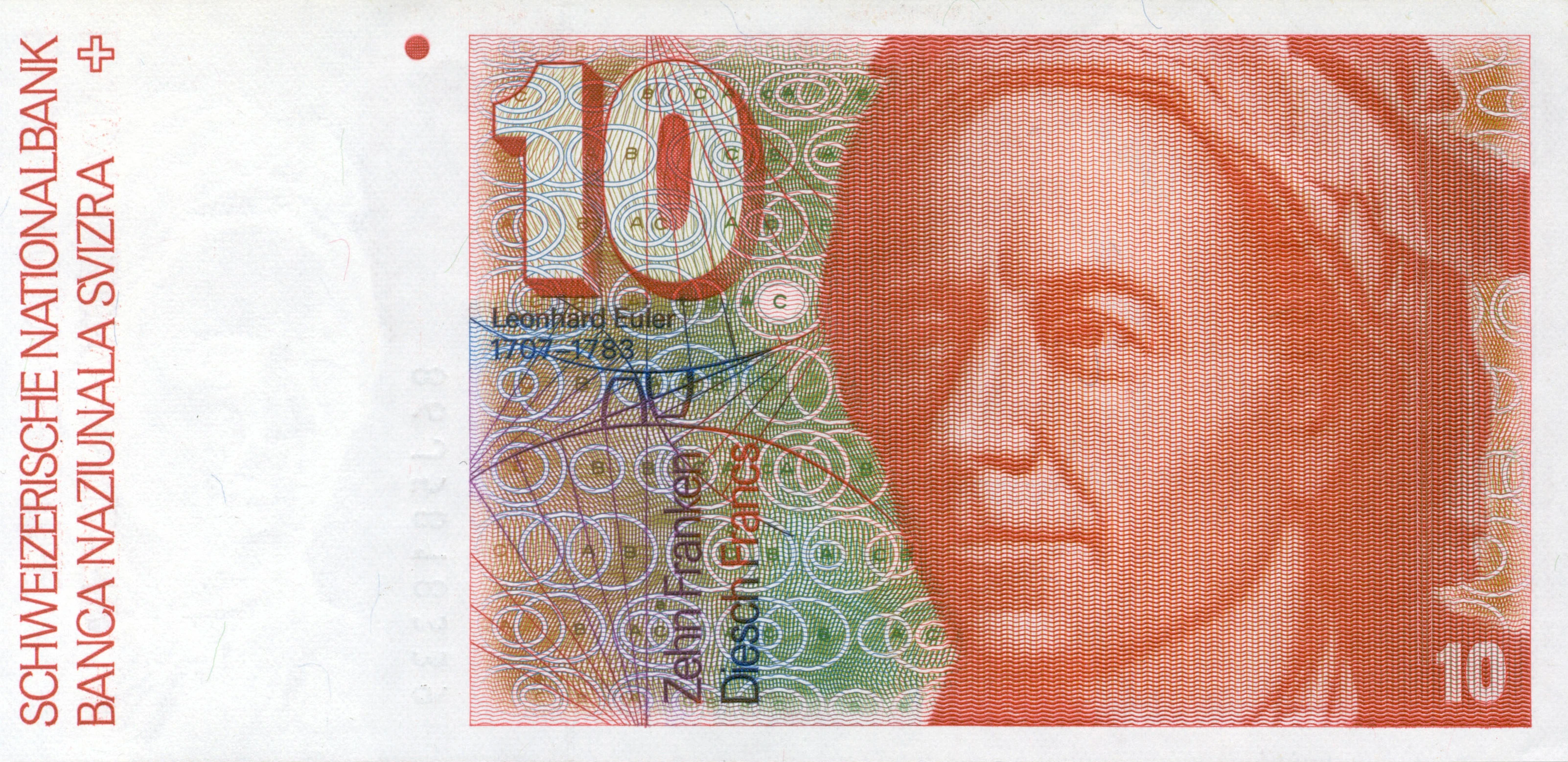 Featured at the center right of the note's obverse is a large, left-facing illustration of Leonhard Euler (1707–1783), a well-known Swiss mathematician and physicist, similar in appearance to the 1753 Portrait of Leonhard Euler by Jakob Emanuel Handmann (1718–1781). The numeral "10" superimposes a portion of the image at the lower right corner of the banknote. To the left is a partially green and orange background consisting of Euler diagrams captioned with "A", "B", and "C", and drawings of several lines coming from a single point and concluding at a curved boundary. One of the "C" items is white in color. A large, three-dimensional numeral "10" is displayed at the top center of the note, inside the area of the background. Its shadow is printed in orange-brown or red-brown ink while the number is a light in color, and the designs on the background underneath are visible through the "10". The caption "Leonhard Euler" is printed in blue below the large numeral, and below that is "1707–1783", signifying the lifespan of Euler. Printed in an upward direction in purple at the bottom center of the note is the German value "ZEHN FRANKEN", and written to the right of it in a similar manner, but with blue and red ink, is the Romansh value "DIESCH FRANCS". Directly outside of the area with the background, near the left of the large "10", is a small, touch-perceptible red/orange dot that can be used by the visually-impaired for identifying the value of the note. Printed vertically and upward in orange or red ink at the left edge of the obverse is the German bank title "SCHWEIZERISCHE NATIONALBANK". Accompanying it to the right is the Romansh "BANCA NAZIUNALA SVIZRA", written in the same manner. A small Swiss cross in red or orange is present above the Romansh text, to the immediate right of the "K" in the German "NATIONALBANK". The area between the bank titles and the aforementioned touch-perceptible dot is deliberately empty. When held against the light, a watermark of Leonhard Euler becomes visible in this portion of the note.