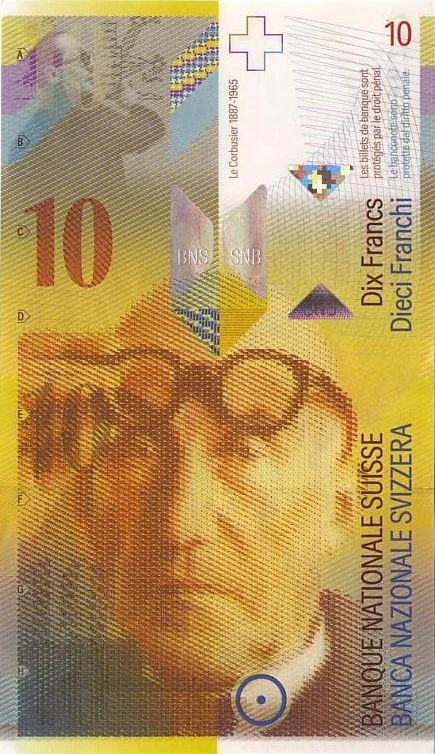 Unlike the earlier sixth and seventh series 10 franc banknotes, there is not a large colored portion at one side of the obverse and reverse; virtually the entire note is colored. Featured at the bottom center of the obverse is a large illustration of Le Corbusier (born Charles-Édouard Jeanneret-Gris; 1887–1965), a Swiss-born French artist known for pioneering modern architecture and designing various works of art and furniture. In the depiction, he is shown facing with his fingers resting on his glasses, which are pulled above his eyes. Superimposing the bottom of the likeness is a blue circle with a dot in the center. This touch-perceptible element is included to facilitate recognition for the visually impaired. At the upper left corner of the note, printed in gray ink, is an image of Le Corbusier sketching out a design. Eight tabs labeled "A" to "H" are located along the left side of the note, and next to each the value "10" is printed in differing types of special ink. The French bank title "BANQUE NATIONALE SUISSE" is printed upward in brown ink to the right of the larger image of Le Corbusier, and written in the same manner next to that, but in blue ink, is the Italian "BANCA NAZIONALE SVIZZERA". A space empty of any designs or text is located directly above these bank titles, but above that space the values "Dix Francs" and "Dieci Franchi" are printed in the locations and colors of their respective bank titles. The counterfeiting notice "Les billets de banque sont protégés par le droit penal." is printed on two lines in small text above the former value, while "Le banconote sono protette dal diritto penale." is written in a similar fashion near the latter value. The French inscription is separated between the words "sont" and "protégés", while the Italian is between "sono" and "prottete". Both, located in the white area of the obverse, essentially translate to English as "Banknotes are protected by criminal law". Included in red at the upper right corner of the obverse, by the Italian counterfeiting notice, is the numeral "10". Directly above the large image of Le Corbusier is a triangle with its point facing downward; the left half is mainly blue while the right is a dark yellow. A Kinegram element is shown to the right of the triangle, while two more Kinegrams are included near the base of the triangle, and another is found to the left of the French counterfeiting notice. The caption "Le Corbusier 1887–1955" is printed vertically in brown ink above the centermost Kinegrams, in the white area, and above that, at the top of the note, is a Swiss cross with a brown outline. Several entwined lines are also present at the upper right of the obverse, in the white area.