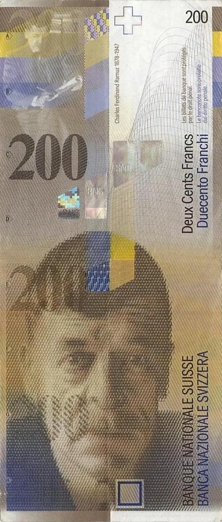 Issuance of the eighth series of Swiss franc notes began in 1995 with the introduction of the newly revised 50 franc note. The first 200 franc note was printed in 1996, but not issued until October 1, 1997. It has since proven more successful than the higher-denominated 500 franc note, which it was made to replace. Like all of the other notes of the eighth series, it was designed by Swiss artist Jörg Zintzmeyer (1947–2009). The 200 franc banknote has vertical orientation, and measures 170 millimeters in width by 74 in height. Its main color is described as brown, but there are elements that are yellow, blue, and white as well. Featured at the bottom left portion of the obverse is a facing image of Charles-Ferdinand Ramuz (1878–1947), a French-speaking Swiss writer who was active during the early to mid 20th century. Superimposed over the bottom of the likeness is a touch perceptible square pattern, which allows the blind and visually impaired to recognize the value. The denomination "200" is written over the image at the left side of the note four times, each with special ink. These values correspond in location with "E", "F", "G", and "H" tabs running down the left portion of the note. Printed vertically in black ink to the right of the image is the French text "BANQUE NATIONALE SUISSE" (English: "Swiss National Bank") which is in turn flanked to the right by the Italian "BANCA NAZIONALE SVIZZERA" (meaning the same as the French text) written in blue ink in the same direction. Directly above the image of Charles-Ferdinand Ramuz are four Kinegram elements. The leftmost of these shows the Swiss cross from the national flag of Switzerland, one has the "BNS" abbreviation for the Swiss National Bank used by French, Italian, and Romansh speakers, while another bears the "SNB" abbreviation used by English and German speakers. When the latter two Kinegram are seen tilted, the denomination is made visible. Near the "A" tab at the side of the note the value is printed in a transparent color, at tab "B" it is a watermark, at tab "C" it is written using intaglio printing, and at tab "D" with perforated ink. An image of Charles-Ferdinand Ramuz at work is shown at the upper left corner of the note. Next to it in a white-colored area is the Swiss cross and the vertically-printed caption "Charles Ferdinand Ramuz 1878-1947". The French value "Deux Cents Francs" (English: "Two hundred francs") is written vertically in black ink at the right edge of the note, with the Italian text of the same meaning, "Duecento Franchi", written to its right in the same direction in blue ink. Printed next to the French value is the text "Les billets de banque sont protégés par le droit penal.", and written next to the Italian value are the words "Le banconote sono protette dal diritto penale."; both translate to English as "Banknotes are protected by criminal law". The note's value is printed once again in the upper right corner as "200".