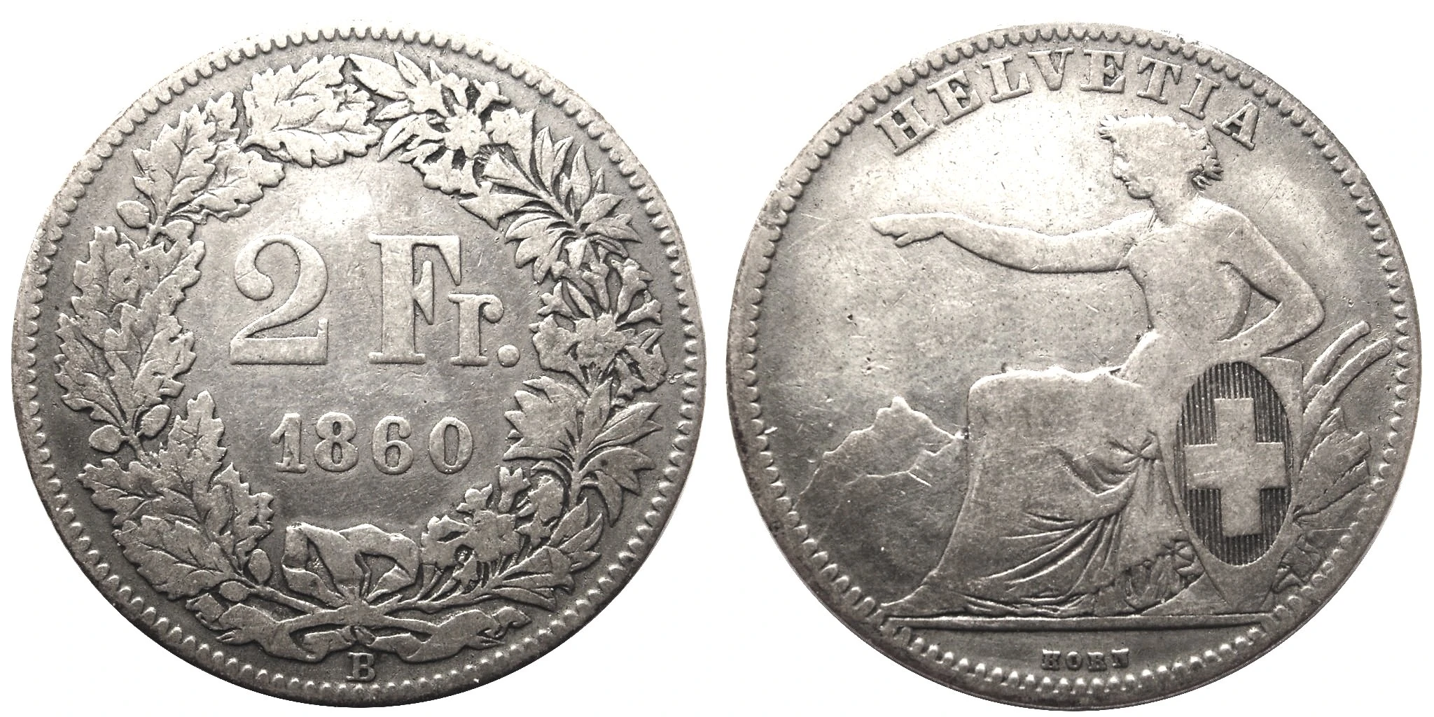 Displayed in the center of the obverse on both varieties is a left-facing illustration of a laureate seated Helvetia. The female personification of Switzerland, Helvetia is shown resting on a plow and grains, holding a shield bearing the Swiss cross inside of an oval with her left hand and extending her right arm toward the left side of the obverse. Such a design was considered unattractive by the Swiss public during the time of the coin's issue, and was met with popular discontent and dissatisfaction. The caption "HELVETIA" appears above the depiction, inscribed in a clockwise direction along the upper periphery of the piece in a serifed font. An exergue is included below the image of Helvetia, its contents depending on the year of minting. Pieces from 1850 display two privy marks: a hand representing the Monnaie de Paris, and the head of a dog, identifying Jean-Jacques Barre (1793–1855), the Graveur général des monnaies at Paris at the time of minting. Later pieces solely include the engraver's name, "KORN", which is written horizontally in small print. "A.BOVY", Antoine Bovy's signature, is present on the 1850 pieces only, engraved in a small font in a counterclockwise direction along the left rim. Switzerland, a multilingual nation, initially adopted three official languages – French, German, and Italian – and would later come to adopt Romansh as well. However, the word "franc" in each language is different, with French and Romansh translating as franc, German as Franken, and Italian as franco. In order to maintain language neutrality on the 2 franc piece, the value is simply abbreviated as "2 Fr." in the center of the reverse, since each local version of "franc", as well as the Latin francus, begins with those two letters. Printed horizontally below in a smaller font is the Gregorian date of the coin's minting. Such items are engraved in the center of a wreath, which extends along the entire outer periphery of the coin. This wreath consists of the branch of an oak (Quercus) at the left and one of an alpine rose (Rhododendron ferrugineum) at the right, both tied together by a small ribbon. Written below in small print, by the rim, is the mark of the producing mint, an "A" for Paris on pieces dated 1850, or a "B" for Bern on coins made from 1857 to 1863.