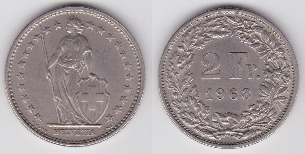 - This article is about the current circulation coin of Switzerland. For more Swiss coins denominated at 2 francs or franken, see Swiss 2 franc coin (disambiguation).