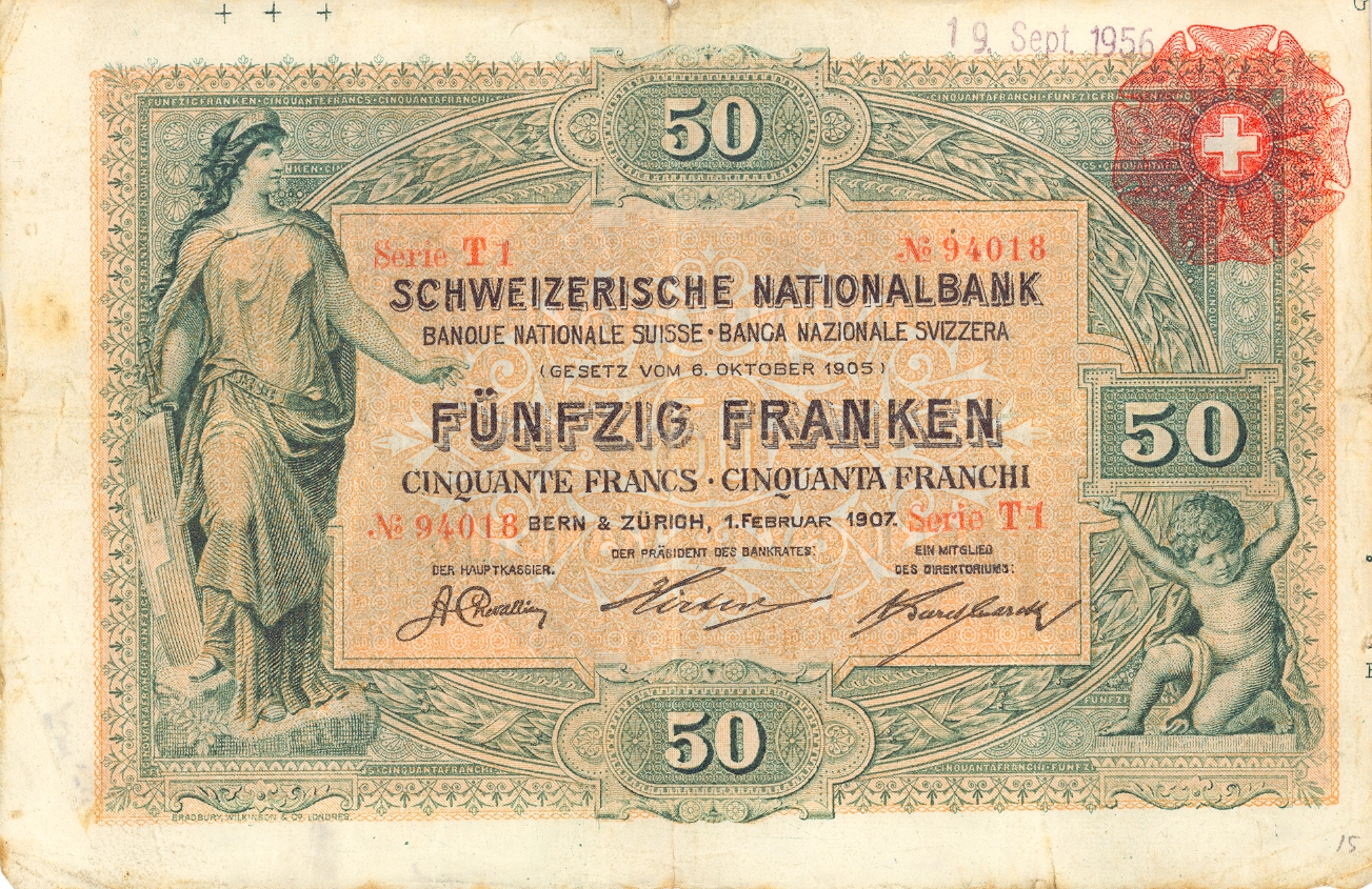 During 1907, the Swiss National Bank was established, and took over issuance of banknotes from the cantons and banks. The first series introduced banknotes in the denominations of 50, 100, 500, and 1000 francs. In 1914, the 5 and 20 franc banknotes were introduced as a part of Switzerland's series 2 of banknotes. During 1952, the issuing of 5 franc notes ceased, but introduced the 10 franc note in 1955. During 1996, the 200 franc note was issued, which was printed to replace the 500 franc note.